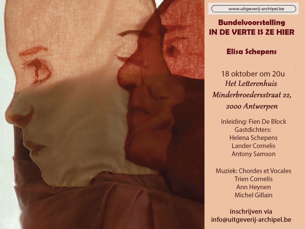 Op 18 oktober stelt Elisa Schepens haar debuutbundel voor in het Antwerpse Letterenhuis. Ik ben vereerd dat ik als gastdichter mag optreden. ‘In de verte is ze hier’ (mooie titel!) wordt uitgegeven door Uitgeverij Archipel.