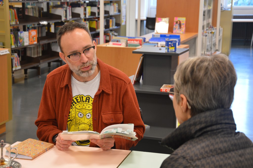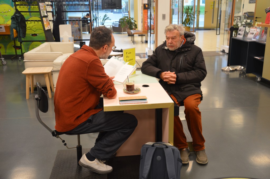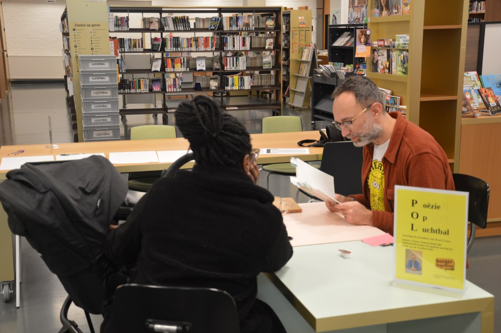 Enkele dagen geleden belde poëzieorganisator en dichter Gust Peeters me met een lastminuteverzoek: of ik een dichter wilde vervangen op Poëzie op Luchtbal, een van de vele poëzie-initiatieven die hij organiseert in het Antwerpse. En zo belandde ik achter een tafeltje in bibliotheek Luchtbal, waar ik tussen 10 en 13 uur eigen werk mocht voorlezen aan bibliotheekbezoekers die daar zin in hadden.