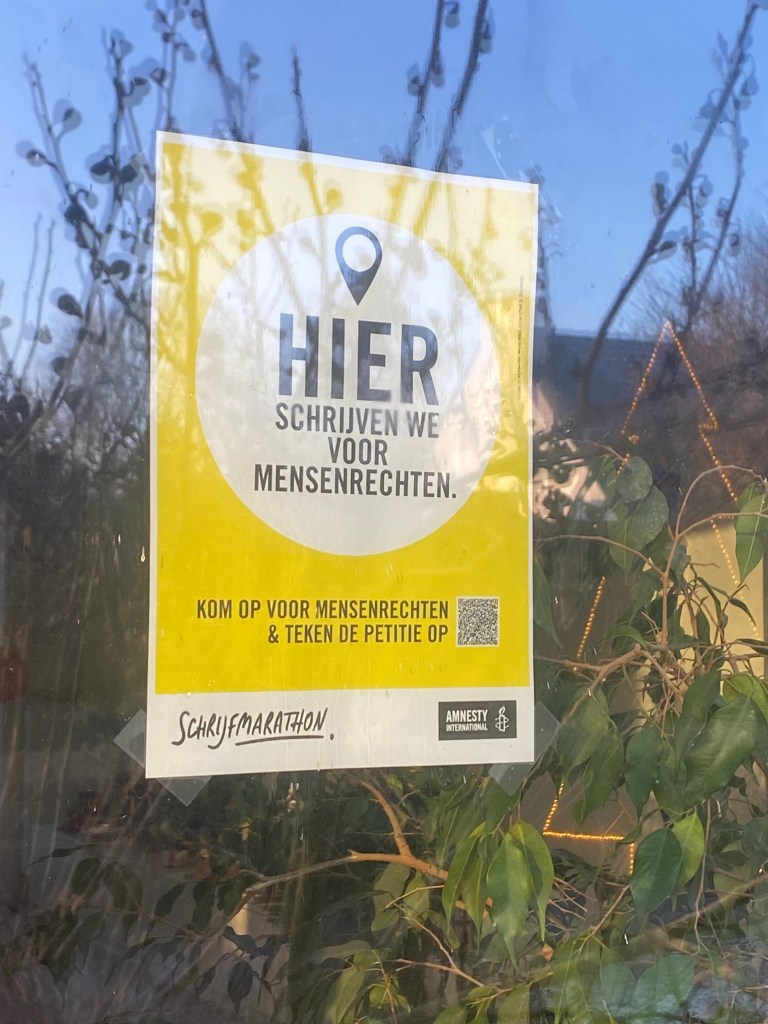 Annelies en ik organiseerden bij ons thuis een Schrijfmarathon voor Amnesty International. Tussen 11 en 18 uur was het een zoete inval van vrienden, familie en buren die brieven hebben (over)geschreven voor mensen en gemeenschappen in nood. De teller stopte bij 81 brieven. Tel daar nog de inspanningen bij van Annelies’ collega’s en van vrienden die thuis schreven, en we ronden vlotjes de kaap van de 100 brieven voor 9 verschillende verhalen.
