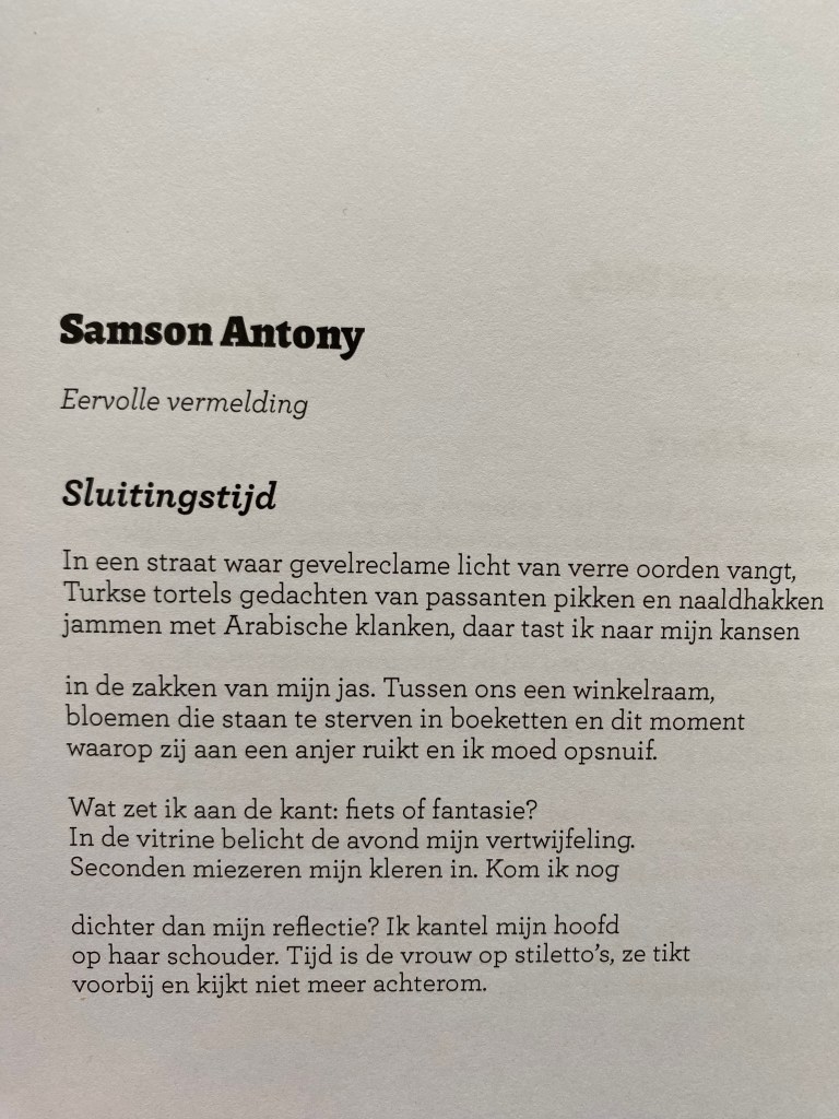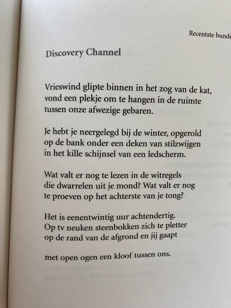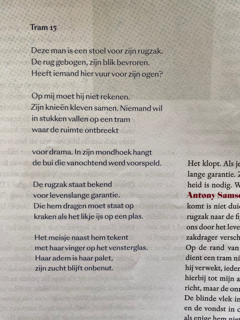 Discovery Channel is een van de twee gedichten die werden gepubliceerd in de bloemlezing Uit de Zeef (2024). Samengesteld door Charles Ducal en Roel Richelieu Van Londersele.Mijn debuutbundel Herinner mij er morgen aan, uitgegeven door De Zeef, november 2023. Meer info op http://www.uitgeverijdezeef.beGedicht Tram 15 in de Poëziekrant (sept/okt 2023).Thuiskomen is een daad is een van de vier gedichten die werden gepubliceerd in Het Liegend Konijn (april 2023). Sluitingstijd kreeg een eervolle vermelding in de bloemlezing van de Poemtata-poëziewedstrijd (2022)